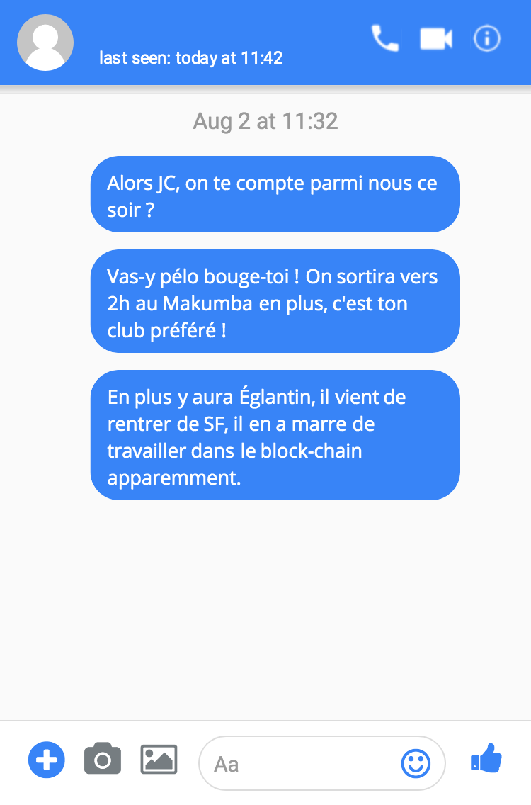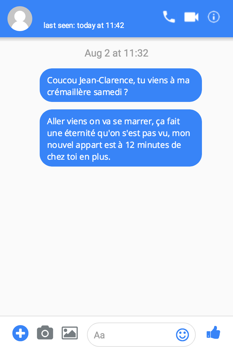 “Dur, dur le lundi…Mais souvenez-vous, samedi, on se met bien !Ramenez ce que vous voulez, une bouteille ou autre.J’ai prévu assez de trucs à manger pour l’apéro.PS : Si vous n’avez pas encore répondu, dites-moi si vous venez pour que je puisse sortir assez de chaises de la cave !”